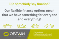 Obtain Automotive is registered in England and Wales under company number: 12600526. Obtain Automotive is authorised and regulated by the Financial Conduct Authority, under FCA number: 930110. We act as a credit broker not a lender. We work with several carefully selected credit providers who may be able to offer you finance for your purchase. (Written Quotation available upon request). Whichever lender we introduce you to, we will typically receive commission from them (either a fixed fee or a fixed percentage of the amount you borrow). The lenders we work with could pay commission at different rates. All finance is subject to status and income. Terms and conditions apply. Applicants must be 18 year or over. We are only able to offer finance products from these providers.